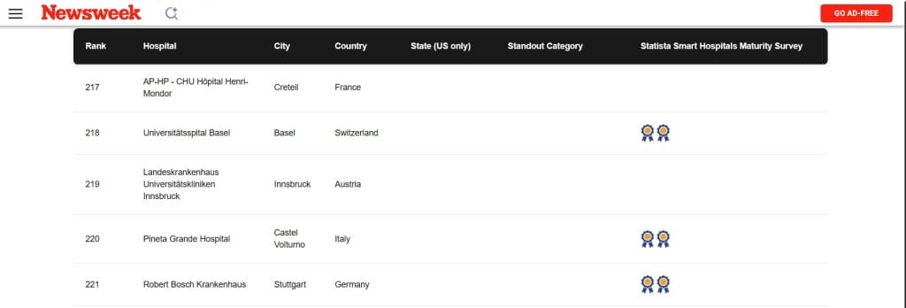 Tra gli altri ospedali italiani in graduatoria figurano: